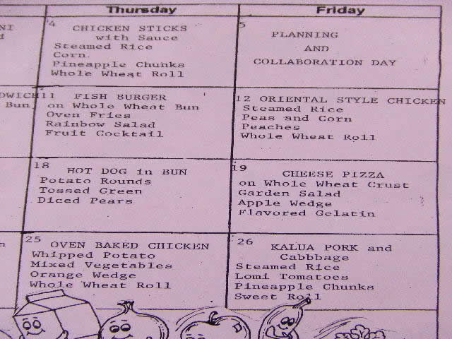 今回のちょっとオモシロイは子供の学校給食のメニューです。写真ではわかりずらいかもしれませんが、堂々とファーストフードの名前「ホットドッグ」「チーズピザ」「フィッシュバーガー」が載っているのです。始めてこのメニューを見た時にはひっくり返りそうになりましたが、考えてみると日本で謂うところの「おにぎり」「お好み焼き」「鮭の塩焼き」