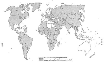メキシコ、エルサルバドル、グアテマラ、コロンビア、エクアドル、インド、ネパール、フィリピン、スリランカ、タイランド、ベトナムなどで、さらにアフリカ、中米の多くの国で、動物が病原ウイルスを持っていると言われます。なお、上記の国々では、現在最も広く使われているHDCV(Human Diploid Cell Vaccine)をWHOが配布しており、首都では接種を受けられると思います。
